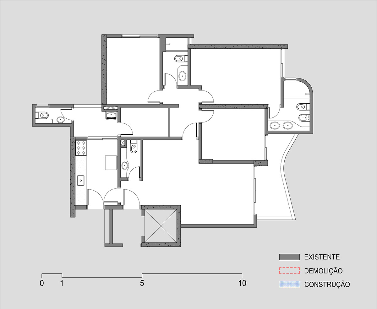 A proposta elimina o dormitório de serviço e lavabo, cria um banheiro de uso íntimo ou social, aumenta a cozinha, lavanderia e sala de jantar, além de solucionar a situação da antiga circulação conflitante.
