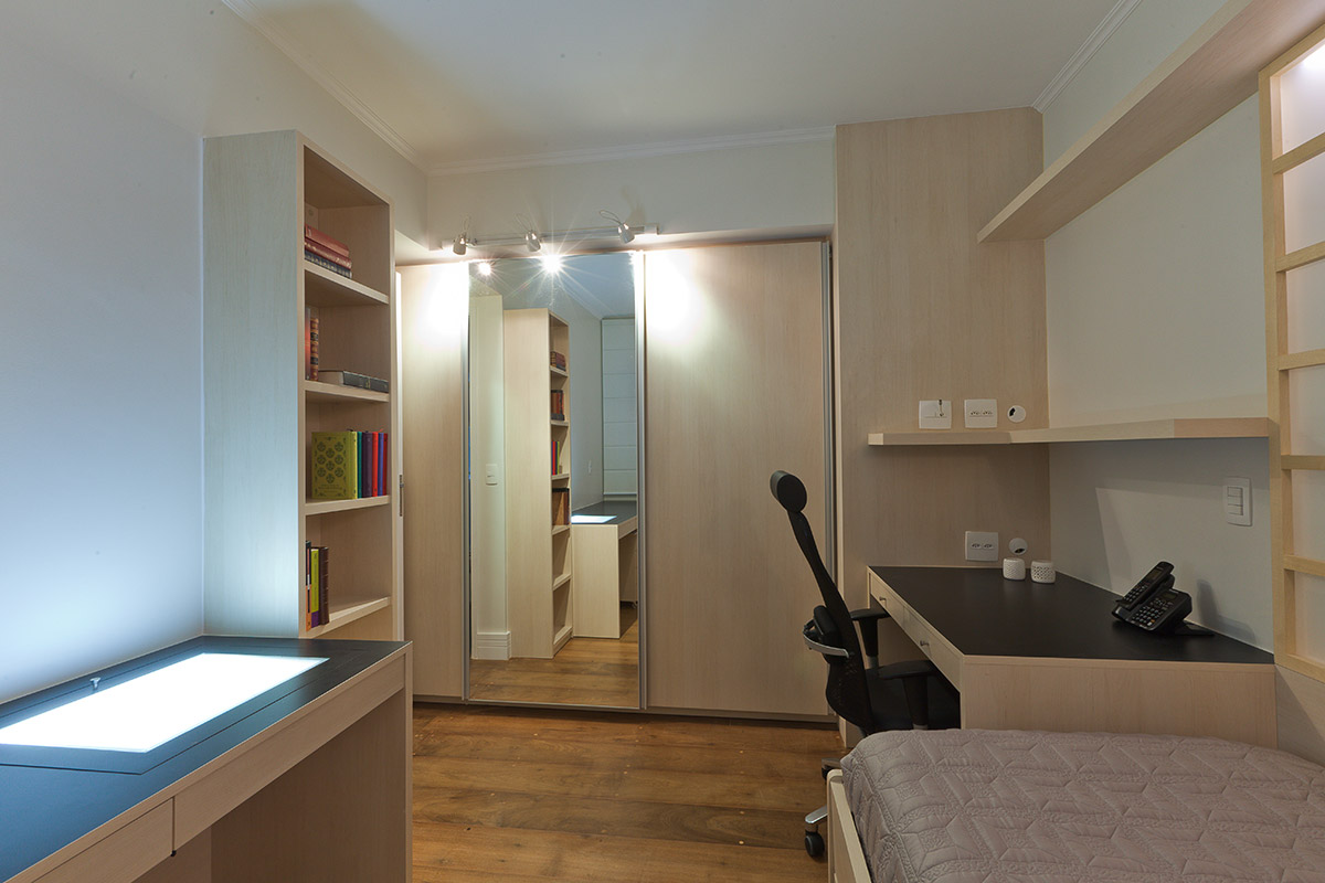 O programa de necessidades solicitava a criação de duas suítes destinadas à proprietária e um filho, e outro dormitório ocasional, a outro filho que não residiria constantemente no apartamento, portanto, que prestasse-se reversivelmente como home-office ou sala íntima, sendo servido de banheiro externo.